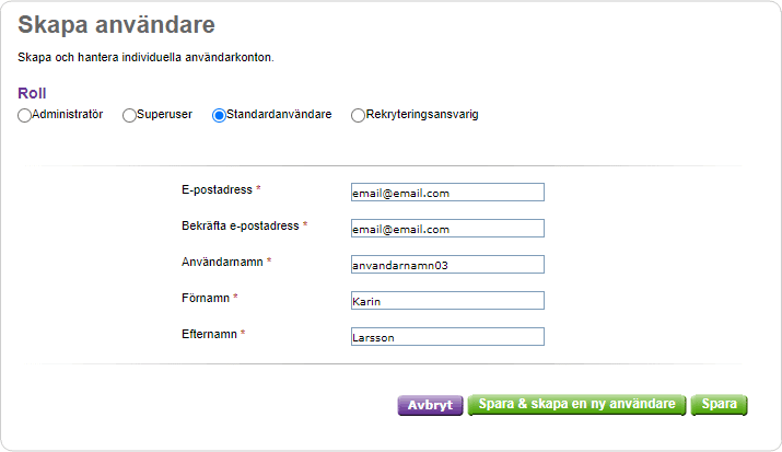 Fyll i namn samt det användarnamn du vill att de ska ha. Du kan välja vilken roll användaren ska ha, som standard blir alla Standardanvändare.