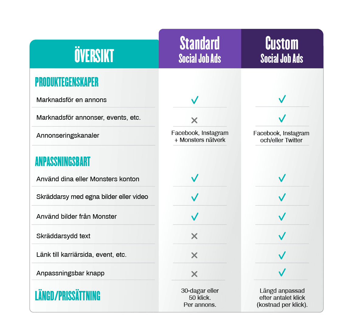 Monster erbjuder två varianter av Social Job Ads: Standard och Custom. Standard Social Job Ad sköts helt automatisk och driver trafik till dina Monsterannonser. Med Custom Social Job Ads kan du skräddarsy utseende och du kan välja om du vill skicka kandidaterna till dina annonser, karriärsida, event, marknadsföring av arbetsgivarvarutmärke, etc. Nedan kan du se en produktjämförelse:
